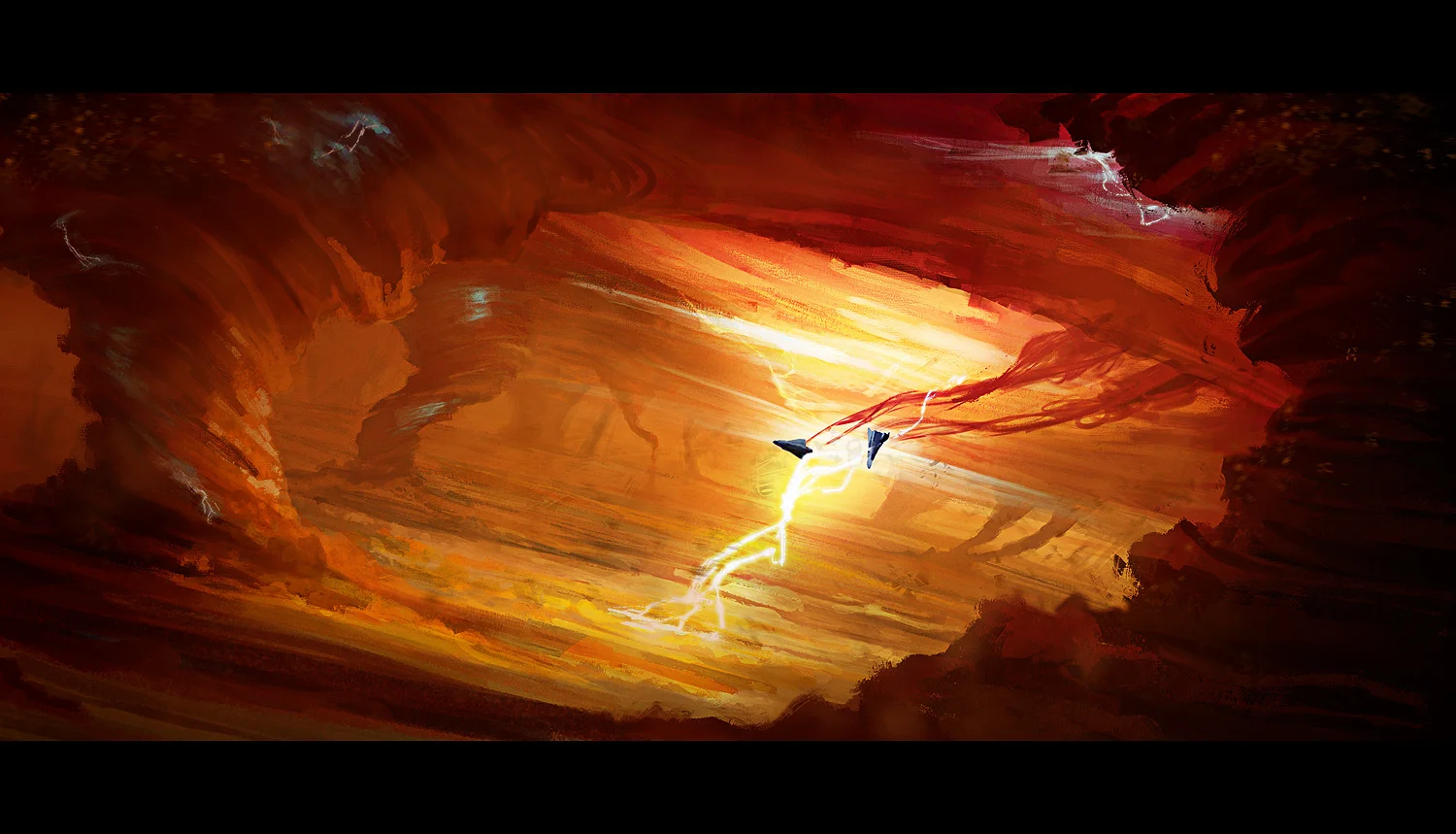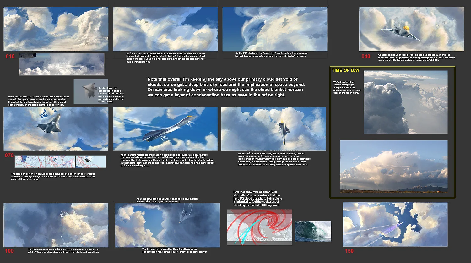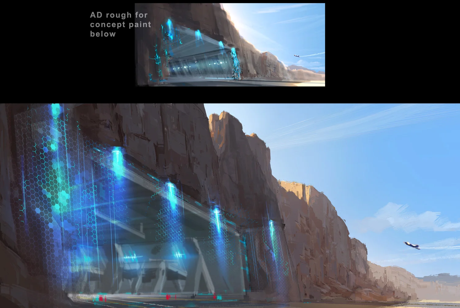 Below are the key story beats myself and two other artists quickly roughed out in about a week and a half for the new proposed direction of the film. The challenge was that we had to maintain full asset in-house design and asset production at our vendor at the same time. Typically I would do the initial rough comp (as noted on a few) and hand it off to be painted and/or paint it myself between tasks and meetings.